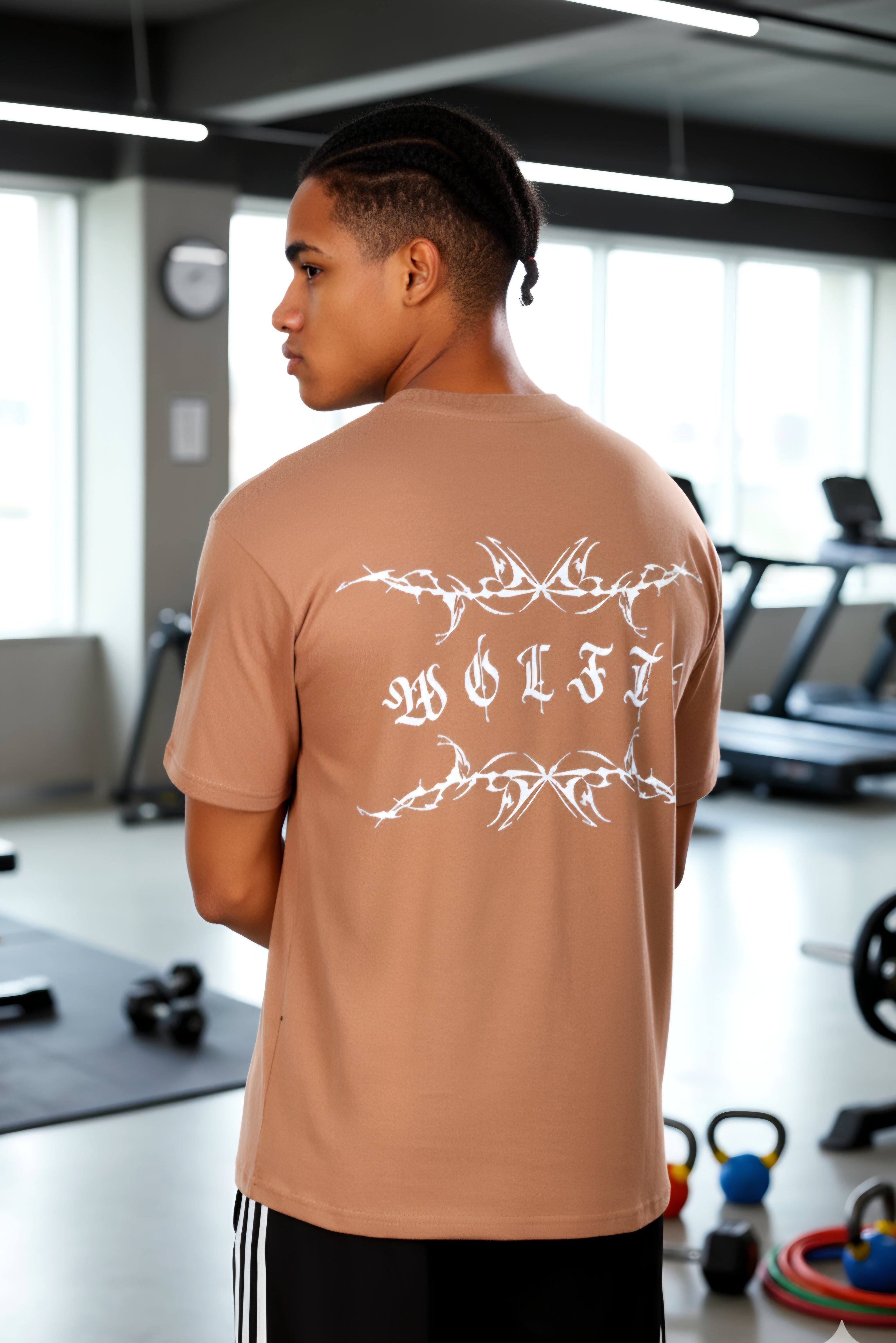 Design: A bold mix of minimal and edgy – this oversized tee features a clean "Wolfit Athleisure" chest print and a striking tribal barbed-wire back graphic wrapped around the gothic WOLFIT logo. Designed to turn heads, built for streetwear energy.
