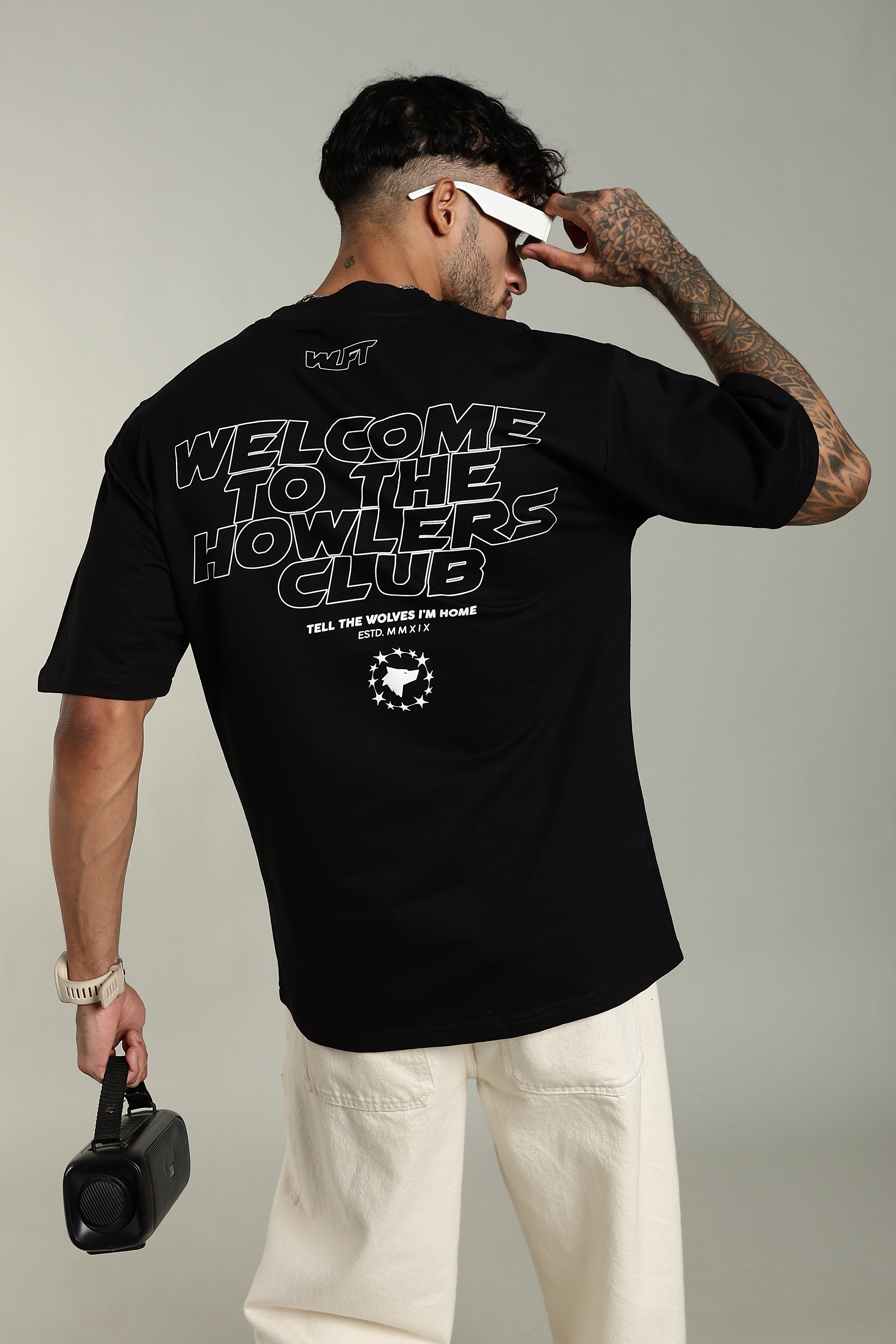 This black tee features a bold, high-contrast streetwear graphic on the back. The core design is "WELCOME TO THE HOWLERS CLUB" 🐺 in dynamic white outline text, complemented by the evocative phrase "TELL THE WOLVES I'M HOME". A circular, wolf-themed emblem 🌟 grounds the design, giving it an exclusive, club-culture aesthetic. The monochromatic white-on-black color scheme ensures maximum impact and visibility ✨.