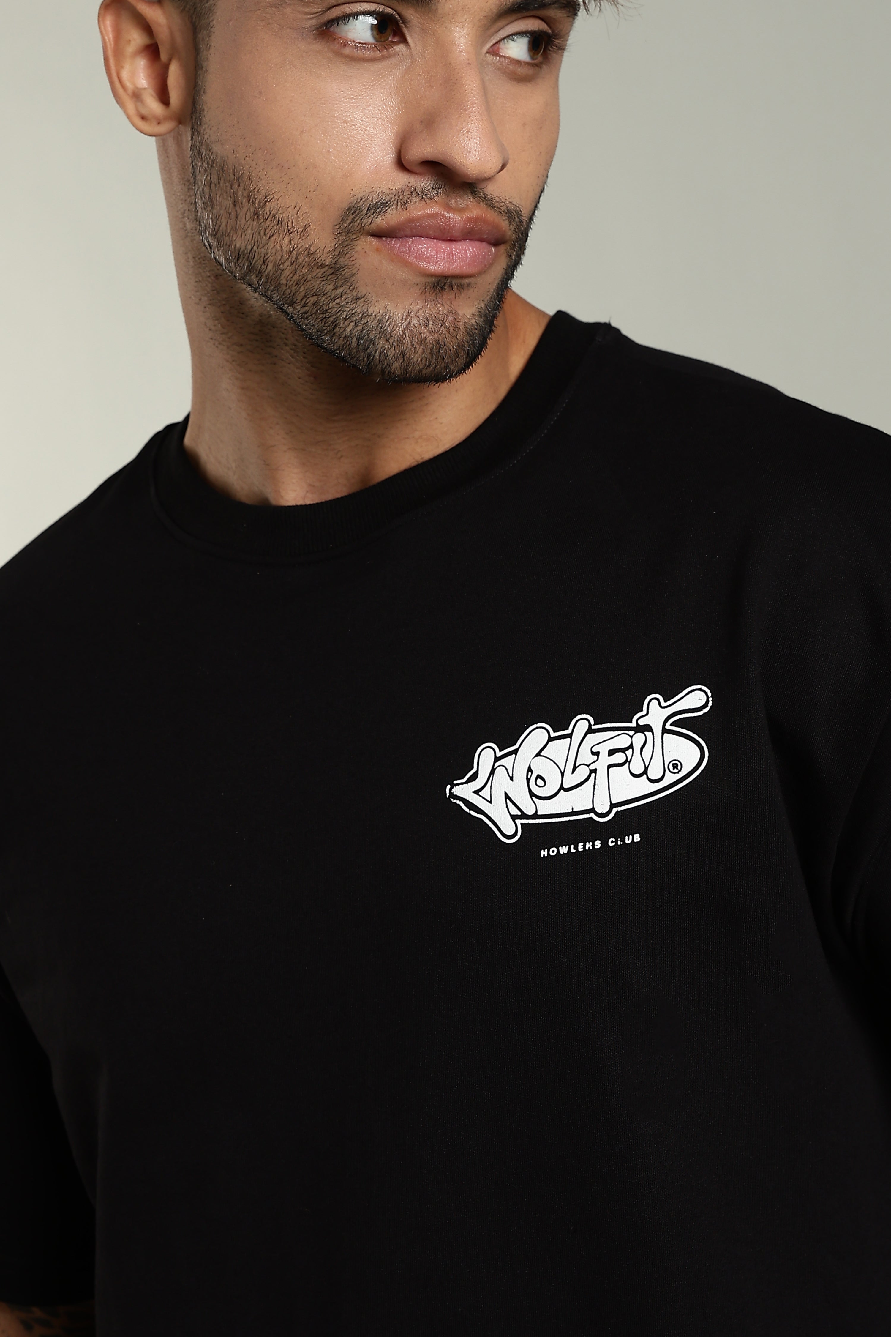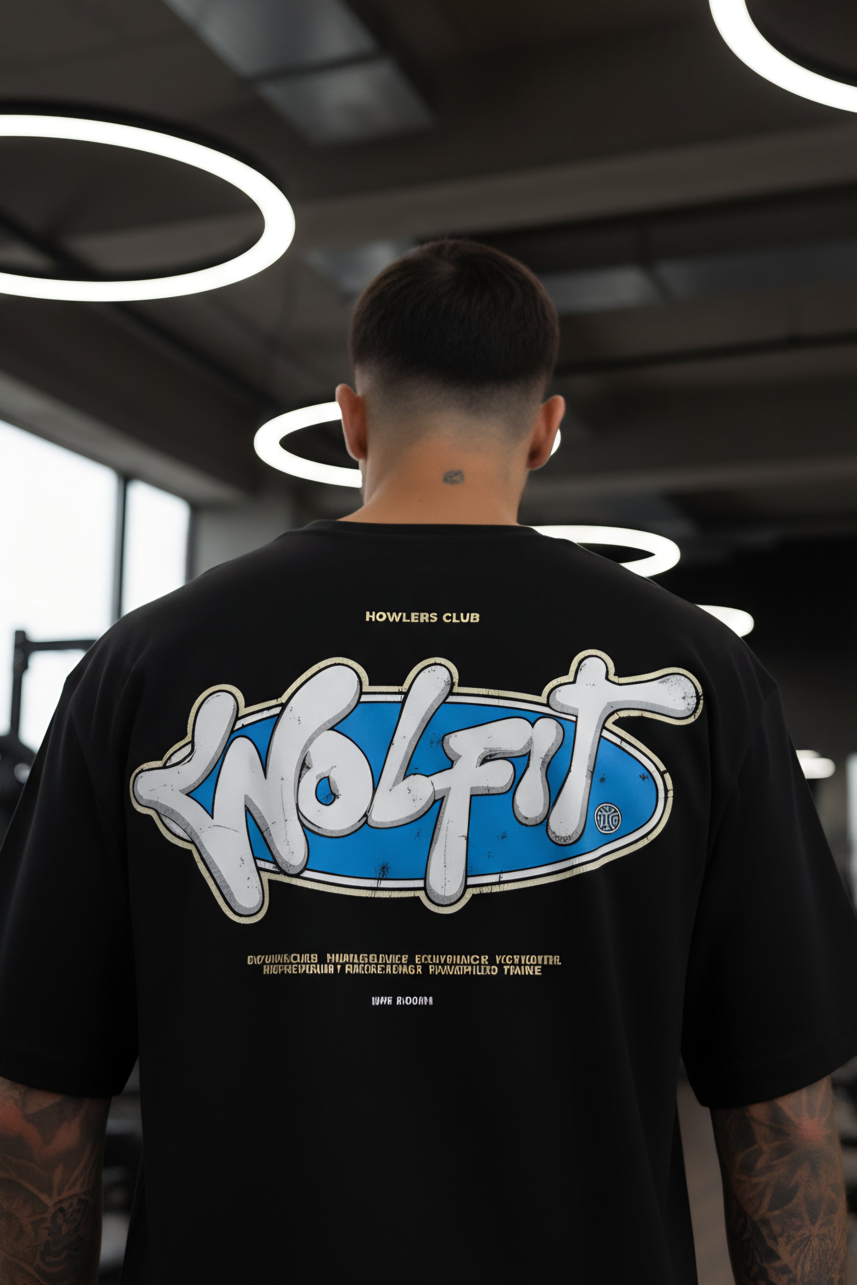 This tee features a vibrant, graffiti-style graphic on the back. The main element is "WOLFFIT" tagged in chunky, 3D lettering inside a distressed cyan bubble 🎨. Above, "HOWLERS CLUB" references the community. The design is anchored by a list of motivational values (Discipline, Consistency, etc.) at the bottom, blending a bold street aesthetic with an aspirational, fitness mindset 💪.