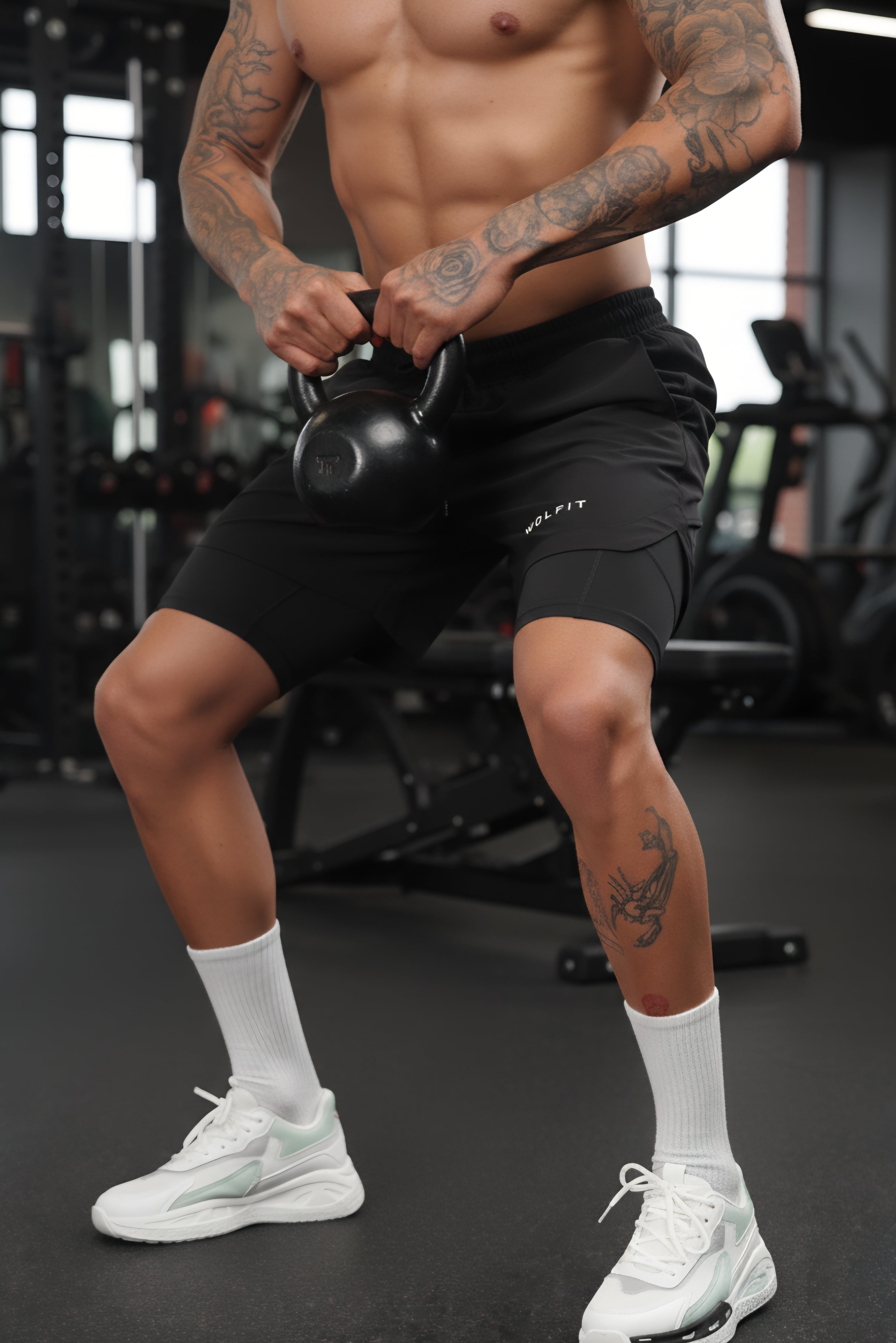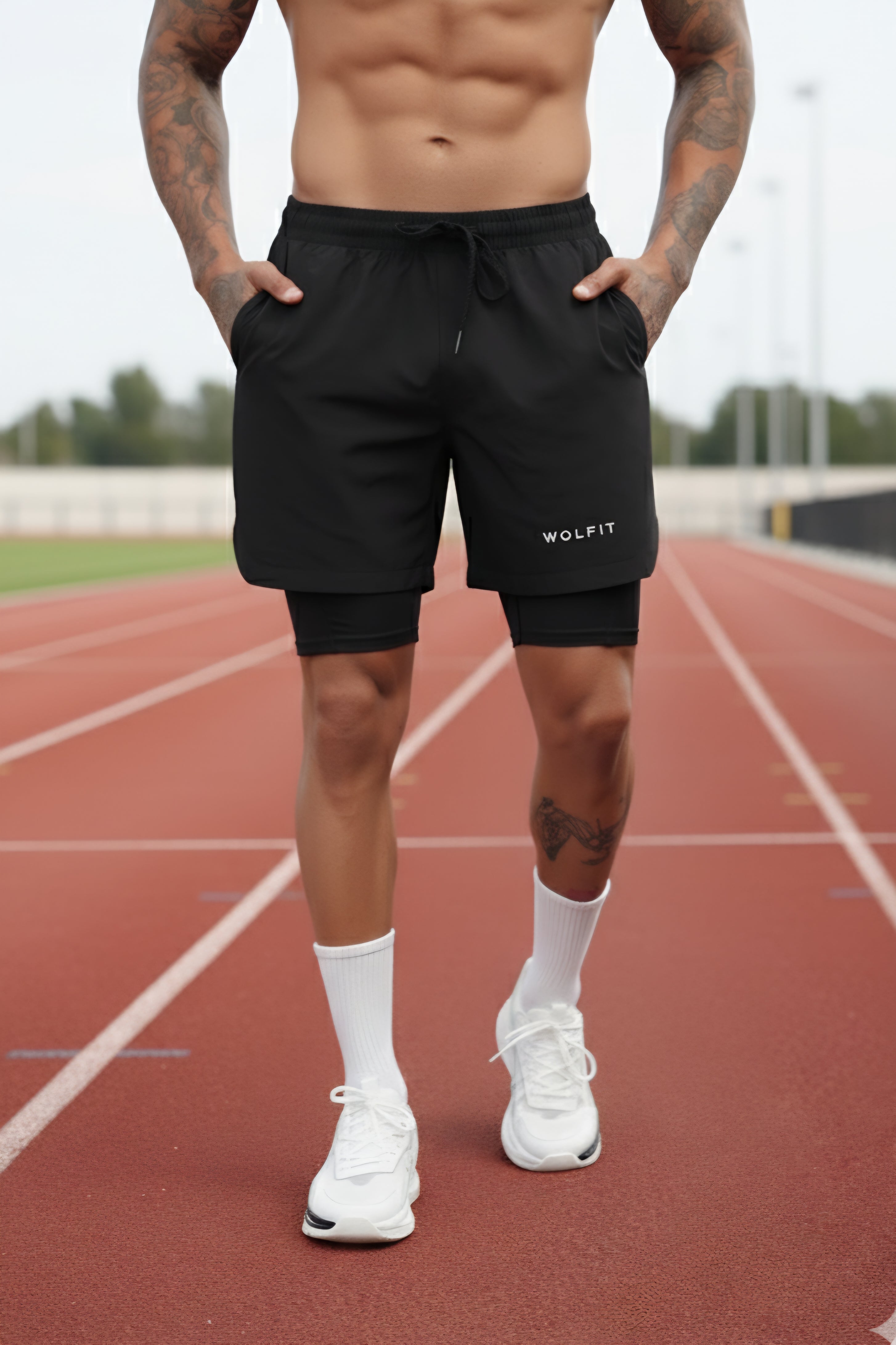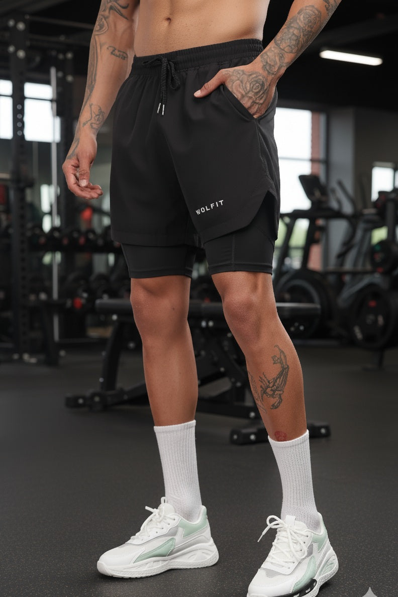 Design: The Wolfit Limitless 2-in-1 Compression Shorts feature a sleek design with subtle branding. The WOLFIT logo is prominently displayed on the left leg, adding a touch of modern flair to the aesthetic. The inner layer has pocket at the right. The dual-layer design not only offers functional benefits but also adds a stylish edge to your workout attire. Additionally, the elastic waistband with a drawstring ensures a secure and customizable fit, making these shorts suitable for all body types.